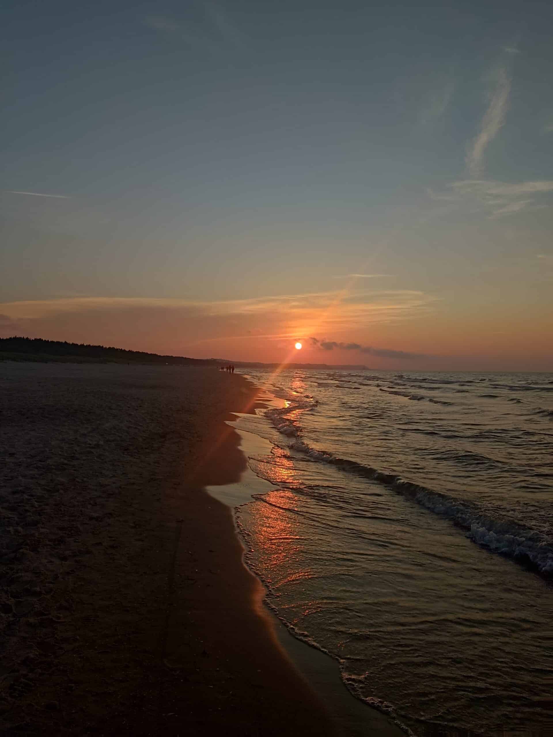 Potem kolejne 30 km po asfalcie i dochodzę do Ustki, a tam czynna latarnia morska… ale tylko w weekendy, więc kieruje się dalej za czerwonym oznakowaniem. Teraz zdecydowanie najprzyjemniejszy fragment trasy, idę od Ustki 10 km przez las blisko klifu z widokiem na zachodzące słońce nad naszym morzem. Widoki zapierają dech w piersiach.