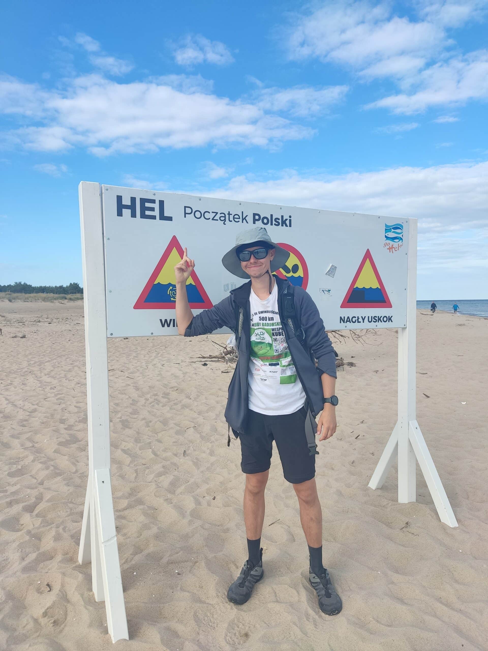 Do przejścia cały Półwysep Helski- z Władysławowa na Cypel Helski. Mijam wieś znaną z piosenki Zbigniewa Wodeckiego, następnie w Jastarni obserwuje najniższą latarnię na polskim wybrzeżu. Upragniona tablica z trzema literami pojawiła się dosyć wcześnie, ale do przejścia jeszcze kilka kilometrów zanim docieram do latarni morskiej na Helu. Stamtąd jeszcze tylko „kilka” kroków i po 10 dniach melduję się na Cyplu Helskim.